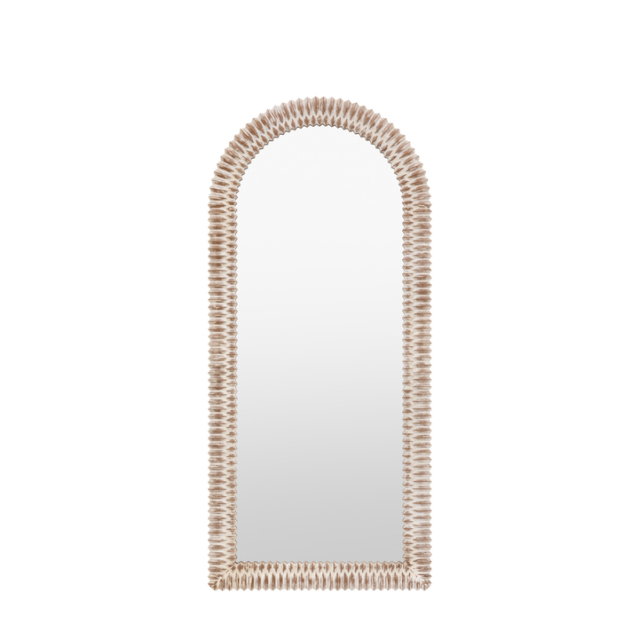 Elevate your decor with the unique charm of our arch-top leaner mirror, highlighted by a stunning 3D wooden etching style frame in a whitewash finish. The graceful arch design adds an elegant curve, while the intricate etching offers a textured, three-dimensional effect that catches the eye. The whitewash wood finish enhances the detailed craftsmanship, making this mirror a standout piece in any room. This versatile mirror offers the flexibility to be styled as a leaner or wall-hung, allowing you to create the perfect look for any space. Material: MDF / Glass Product Zone: Indoor Type - Mirror: Leaner Style - Mirror: Artisan Shape - Mirror: Arched Hanging Orientation: Portrait Glass Type: Plain Glass Size mm: 1500x750 Frame Width: 100mm Frame Colour: Antique White Fixing Type: D-Ring Anti Topple Kit Included: Yes