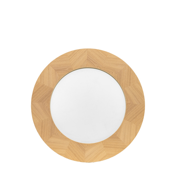 A cool and sleek round wall mirror featuring a beautiful inlay chevron design, made using European oak and rustic oak structured veneers which show the natural beauty of the oak grain and knots. Finished in a specialist mat lacquer, which keeps the timber looking natural and dry, with brushed out grain, this is tactile to the touch and looks amazing. Material: Oak /Oak Veneer / MDF Type - Mirror: Wall Style - Mirror: Wood / Wood Effect Shape - Mirror: Round Hanging Orientation: Portrait Glass Type: Plain Frame Width: 150mm Fixing Type: D-Ring
