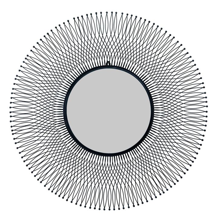 A mesmerizing fusion of industrial design and contemporary artistry defines this black wire mirror, featuring an intricate geometric pattern that creates fascinating depth and dimension. The expansive circular silhouette serves as an arresting focal point, while the wire framework casts enchanting shadows that dance across your walls throughout the day. For a cohesive display that maximizes visual interest, pair this statement piece with the Black Cast Lattice Vases, which echo its linear aesthetic, or create contrast with the organic forms of the Chianti Artichoke and Gold Pinecone Finial. The Amalfi Column Candle Holders in grey provide additional vertical elements that complement the mirror's strong linear presence, while the Tiber White Ceramic Vases offer a serene counterpoint to the industrial wire design.