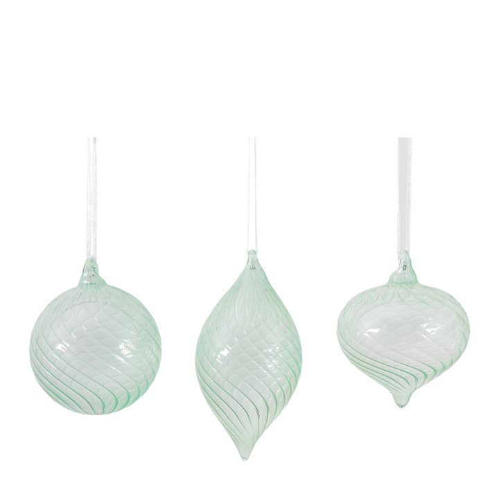 Fluted ridges add texture and catch the light on these stunning baubles in subtle sheer mint colour. The set comprises of three different shaped baubles, a classic round, an onion shape and a delicate droplet shape. Material: Glass / Cotton Ribbon Product Zone: Indoor Additional Information: Colour: Mint Green