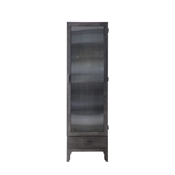 For a retro feel, this 1 door display unit offers an updated take on a classic 50’s look. The matt grey finish of the steel pairs beautifully with the ridged tempered glass creating a stunning piece which would look at home in a wide variety of interiors, including orangeries and conservatories to add an unusual twist to their look. There is also a 2 door version. Material: Iron / Glass Product Zone: Indoor Storage: 1 Door / 1 Drawer / 3 Shelves Internal Cupboard Size: 1300x400mm Adjustable Shelves: Yes Distance between shelves: Adjustable Shelves Assembly Required: Yes - shelves only Anti Topple Kit: Yes Additional Information: Tempered glass
