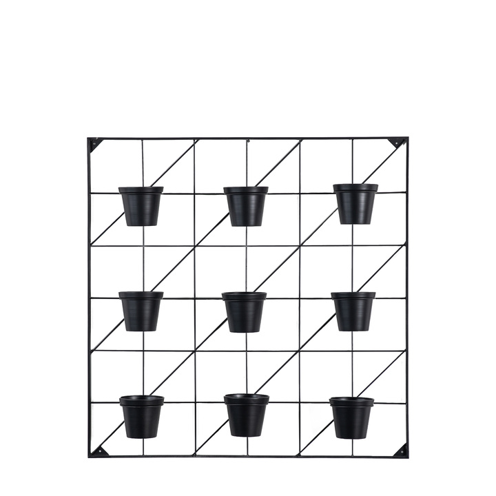 This stunning wall planter features a metal frame and nine black pots, giving a great way to create a greenery wall. It is suitable for both indoor and outdoor use. The frame and pots are packed separately. It is also available with white & terracotta pots and both are offered in a rectangular style with eight pots. Material: Iron Additional Information: 124x124x110mm