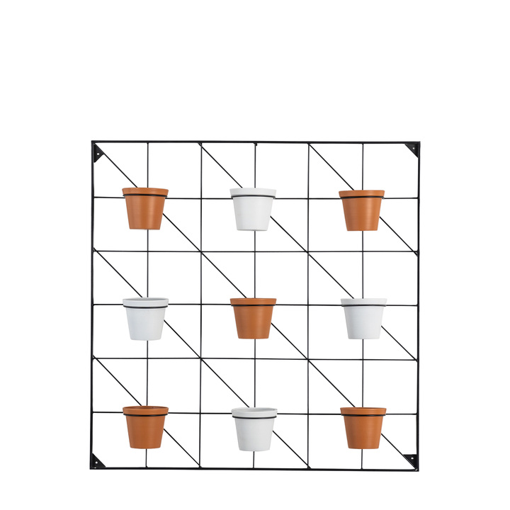 This stunning wall planter features a metal frame and nine pots, giving a great way to create a greenery wall. It is suitable for both indoor and outdoor use. The frame and pots are packed separately. It is also available with black pots and both are offered in a rectangular style with eight pots. Material: Iron Additional Information: 124x124x110mm