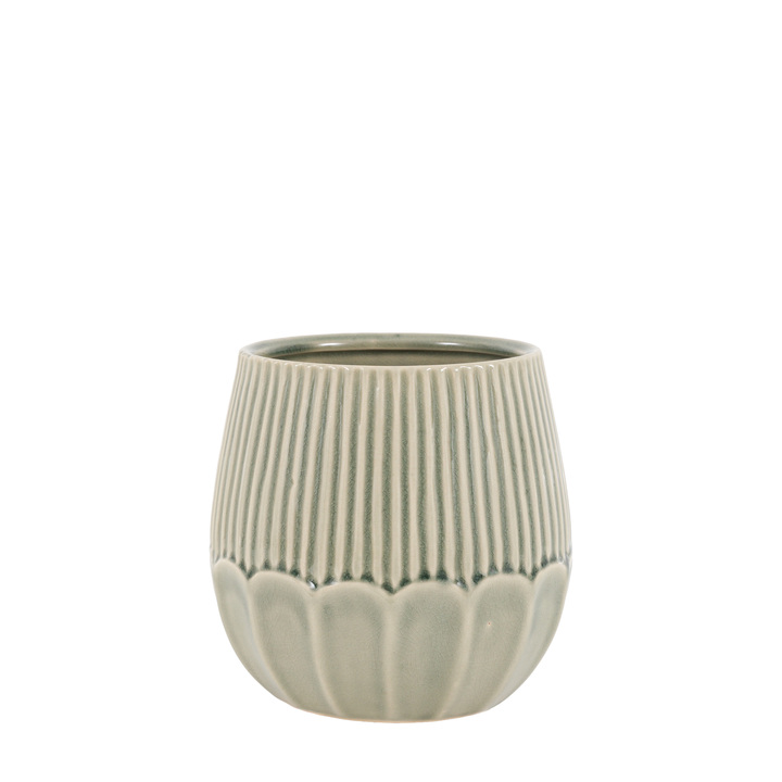 With an organic feel, a soft green glaze, and a petal design finished with elegant ridges, this pot will complement and showcase any greenery. Drainage hole in base. Material: Stoneware Product Zone: Indoor Additional Information: May not be 100% waterproof - inner pot required