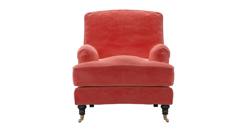 A classic design and one of our most popular sofas. back cushions: feather and fibre color: pink covers: fixed seat cushions: feather wrapped foam size: Armchair