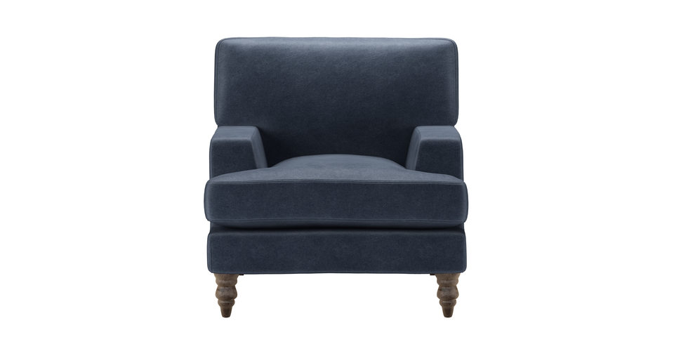 Our Isla mixes drawing room elegance with luxurious lounging. It sits on insanely smart turned wooden legs, and would grace any environment with refined style. Please note that when ordered in our leather fabrics, the covers are fixed and therefore cannot be removed like other textile upholstery options. However, the cushion covers are fully removable on all Isla sofas. back cushions: feather and quallofil fibre color: Blue, Grey covers: loose seat cushions: fibre wrapped foam size: Small Armchair