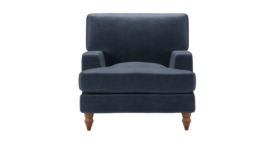 Our Isla mixes drawing room elegance with luxurious lounging. It sits on insanely smart turned wooden legs, and would grace any environment with refined style. Please note that when ordered in our leather fabrics, the covers are fixed and therefore cannot be removed like other textile upholstery options. However, the cushion covers are fully removable on all Isla sofas. back cushions: feather and quallofil fibre color: Blue, Grey covers: removable covers seat cushions: fibre wrapped foam size: Armchair