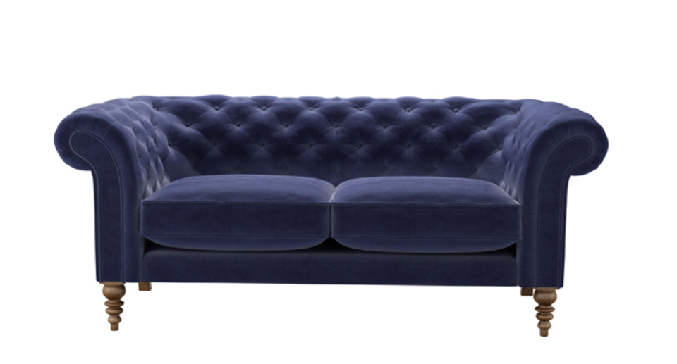 The Chesterfield gets a leggy new look. back cushions: see website color: blue covers: see website seat cushions: see website size: 2.5 Seat Sofa