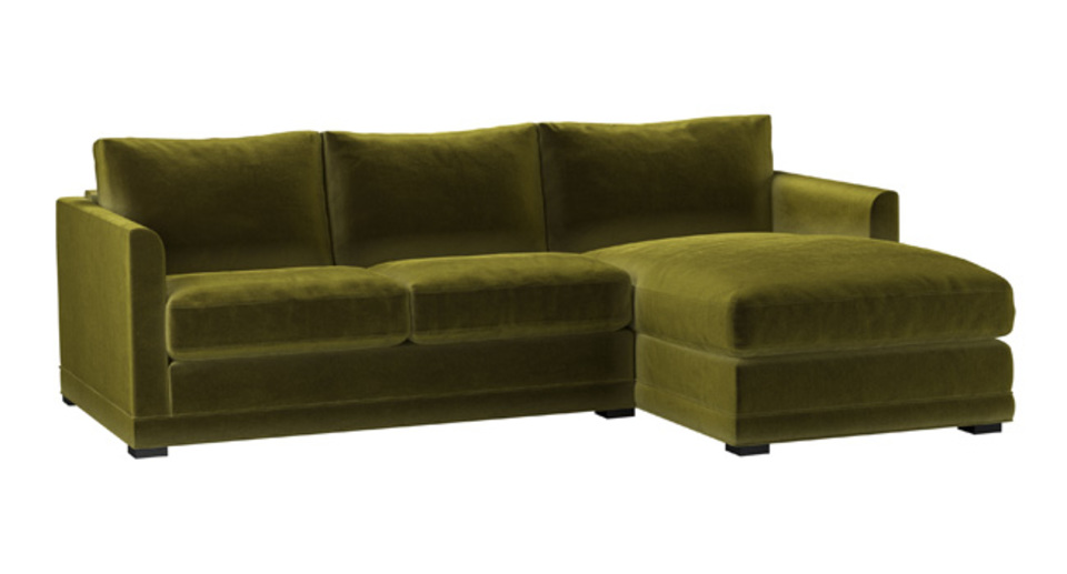 A sofa made for corners. back cushions: feather and fibre color: green covers: fixed seat cushions: feather wrapped foam size: Small Right Hand Chaise