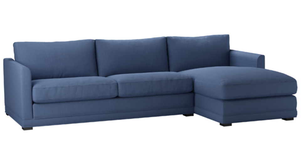 A sofa made for corners. back cushions: feather and fibre color: blue covers: fixed seat cushions: feather wrapped foam size: Large Right Hand Chaise