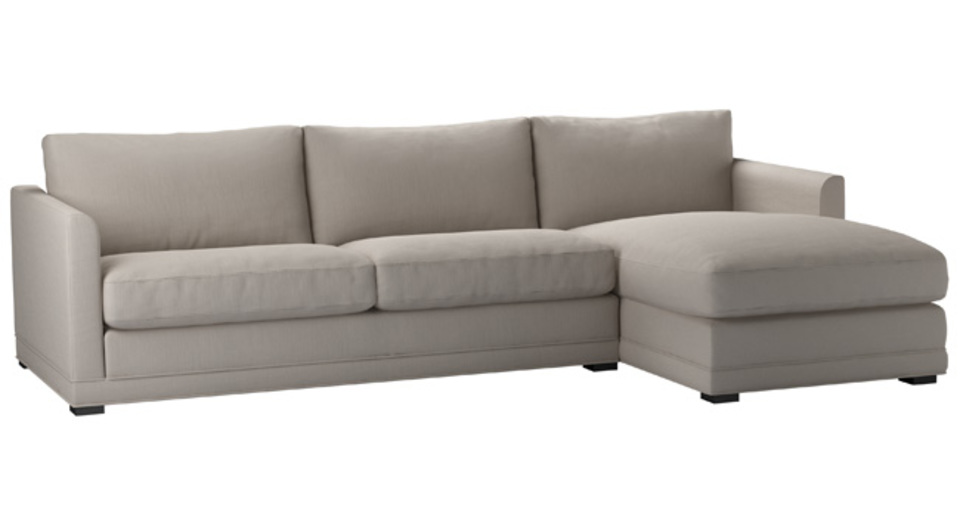 A sofa made for corners. back cushions: feather and fibre color: grey,natural covers: fixed seat cushions: feather wrapped foam size: Large Right Hand Chaise