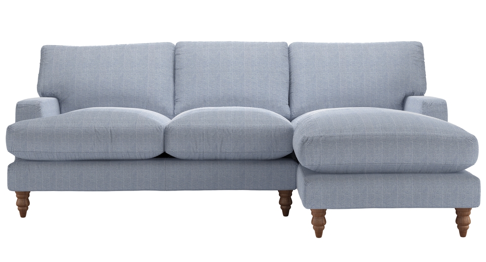 Our Isla mixes drawing room elegance with luxurious lounging. It sits on insanely smart turned wooden legs, and would grace any environment with refined style. As beautiful as the Scottish island it's named after. back cushions: feather and quallofil fibre color: blue covers: loose seat cushions: quallofil fibre wrapped foam size: Right Hand Chaise