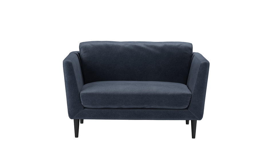 The Holly's retro-inspired shape and simple elegance is a nod to the sleek and curvy mid-century style. A neat frame - with high, splayed arms, a deep seat, and lots of comfy cushions - sits on tall tapered legs. This is one cool sofa... back cushions: feather color: Blue, Grey covers: fixed seat cushions: feather wrapped foam size: Loveseat