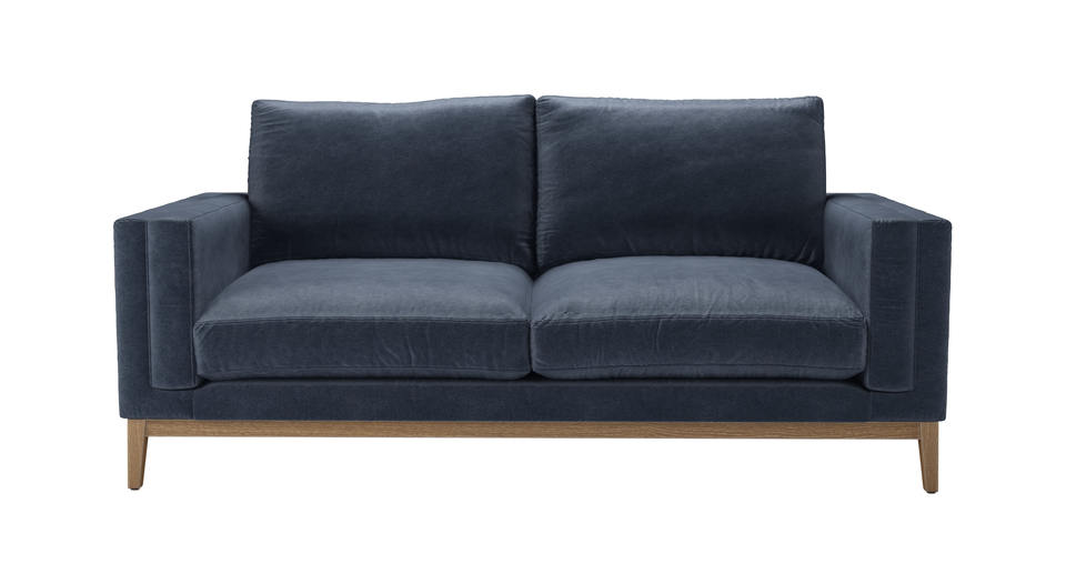 Costello has a simple shape that doesn't compromise on comfort as its plump seat and back cushions are nestled between two sumptuous arms. It has removable cushion covers allowing them to be easily cleaned or replaced and its simple design makes it incredibly versatile. Resting upon either a wooden plinth (or available with stunning chrome legs), this striking sofa design will give a mid-century feel to any living space. back cushions: feather and quallofil color: Blue, Grey covers: removable seat cushions: quallofil fibre wrapped foam size: 2.5 Seat Sofa