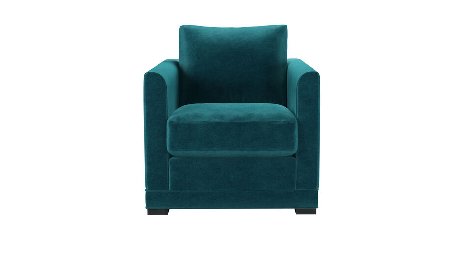Simple, elevated style that prioritises comfort. Svelte arms with an inner curve maximise the sumptuous seating space. The Aissa has sleek lines stitched into its base that lies close to the floor, giving it a contemporary feel. back cushions: feather and fibre color: green,blue covers: fixed seat cushions: feather wrapped foam size: Armchair