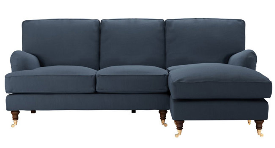 The Bluebell is an undisputed classic. Its turned wooden legs give it a very elegant, understated feel. Supremely comfortably and a real pleasure to live with, whether in a classic or modern setting. The Bluebell is also available as a 'breakdownable' sofa which means even if your home has restricted access you can still enjoy Bluebell's charm and comfort as we will deliver it to you in pieces and assemble in upon arrival. back cushions: feather and fibre color: blue covers: fixed with removable cushion covers seat cushions: feather wrapped foam size: Right Hand Chaise