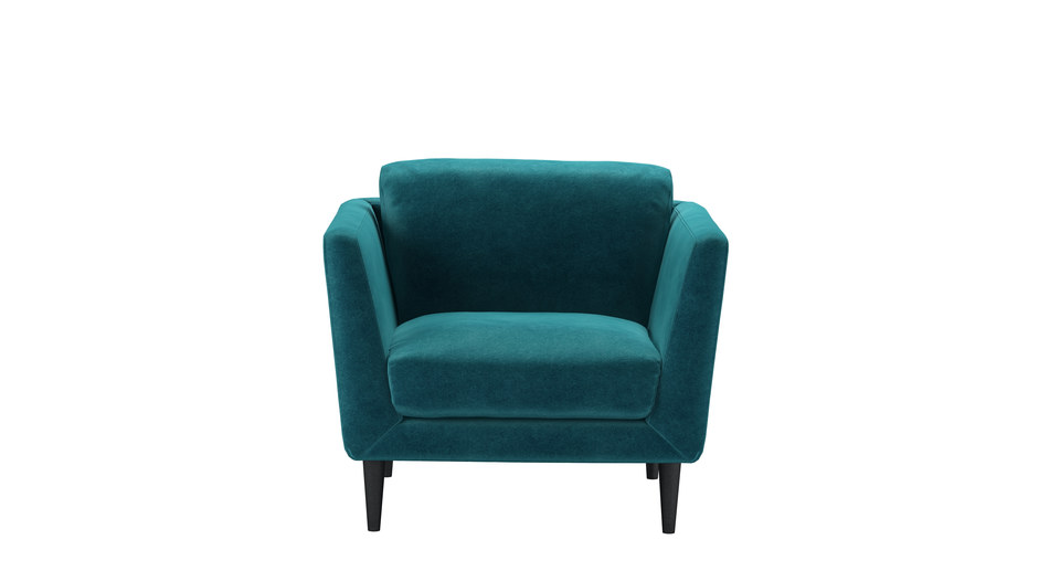 The Holly's retro-inspired shape and simple elegance is a nod to the sleek and curvy mid-century style. A neat frame - with high, splayed arms, a deep seat, and lots of comfy cushions - sits on tall tapered legs. This is one cool sofa... back cushions: feather color: green,blue covers: fixed seat cushions: feather wrapped foam size: Armchair