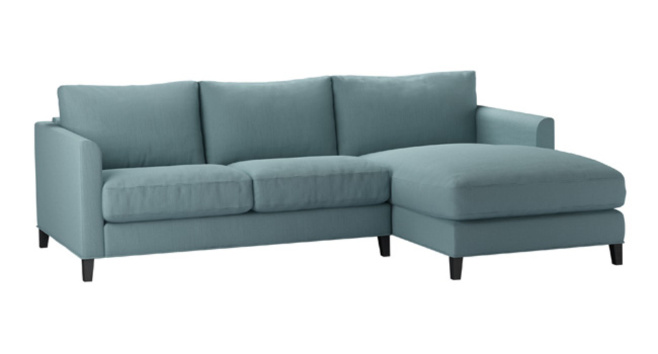 The Izzy's modest and contemporary style is perfect for practical and simple living. A straight-edged frame - with structured arms, plump cushioned seats and tall oak legs - make this one comfy sofa. The Izzy is also available in a modular form that enables you to create a sofa that is the perfect size and style for your home. back cushions: feather and fibre color: blue covers: fixed seat cushions: feather wrapped foam size: Small Right Hand Chaise