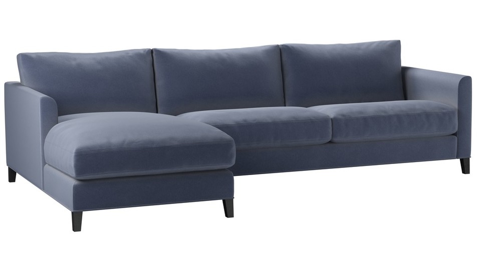 The Izzy's modest and contemporary style is perfect for practical and simple living. A straight-edged frame - with structured arms, plump cushioned seats and tall oak legs - make this one comfy sofa. The Izzy is also available in a modular form that enables you to create a sofa that is the perfect size and style for your home. back cushions: feather and fibre color: blue covers: fixed seat cushions: feather wrapped foam size: Large Left Hand Chaise