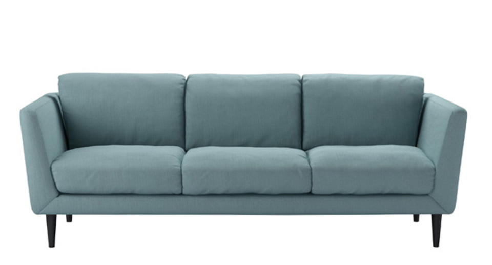 The Holly's retro-inspired shape and simple elegance is a nod to the sleek and curvy mid-century style. A neat frame - with high, splayed arms, a deep seat, and lots of comfy cushions - sits on tall tapered legs. This is one cool sofa. back cushions: feather color: blue covers: fixed seat cushions: feather wrapped foam size: Three Seat Sofa
