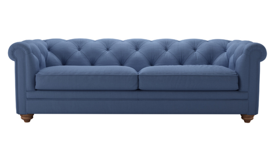 The Patrick is a fine fellow, exceptionally crafted to create the detailed, buttoned and pleated back that you see. Based on the classic Chesterfield design, ours offers superior comfort too! back cushions: see website color: blue covers: see website seat cushions: see website size: Three Seat Sofa
