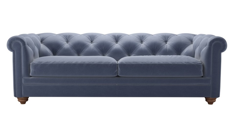 The Patrick is a fine fellow, exceptionally crafted to create the detailed, buttoned and pleated back that you see. Based on the classic Chesterfield design, ours offers superior comfort too! back cushions: see website color: blue covers: see website seat cushions: see website size: Three Seat Sofa