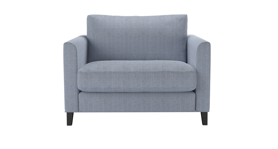 The Izzy's modest and contemporary style is perfect for practical and simple living. A straight-edged frame, with structured arms, plump cushions and tall oak legs make this one comfy sofa! Its slender arms with a gentle curve add an air of charm to the minimalist design. back cushions: feather and fibre color: blue covers: fixed seat cushions: feather wrapped foam size: Loveseat