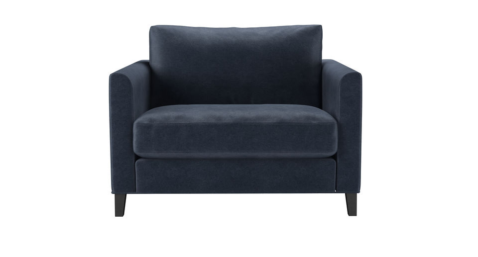 The Izzy's modest and contemporary style is perfect for practical and simple living. A straight-edged frame, with structured arms, plump cushions and tall oak legs make this one comfy sofa! Its slender arms with a gentle curve add an air of charm to the minimalist design. back cushions: feather and fibre color: Blue, Grey covers: fixed seat cushions: feather wrapped foam size: Loveseat