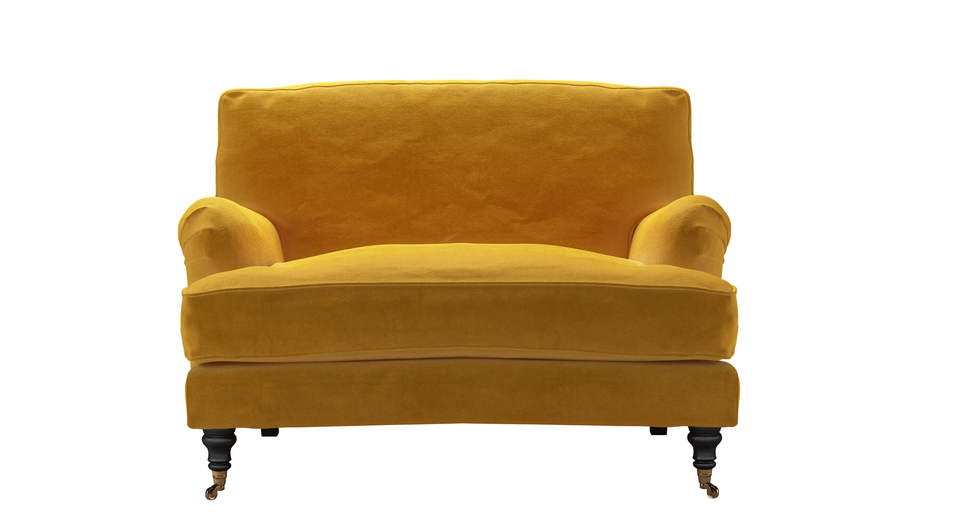 A classic design and one of our most popular sofas. back cushions: feather and fibre color: yellow covers: fixed seat cushions: feather wrapped foam size: Loveseat