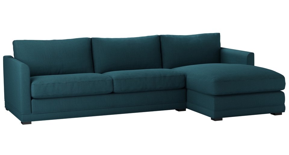 A sofa made for corners. back cushions: feather and fibre color: green covers: fixed seat cushions: feather wrapped foam size: Large Right Hand Chaise