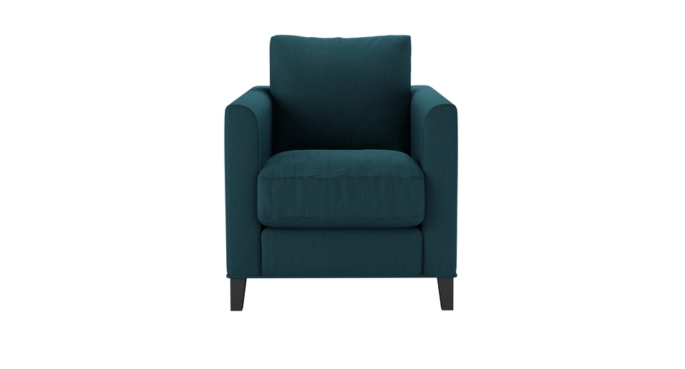 The Izzy's modest and contemporary style is perfect for practical and simple living. A straight-edged frame, with structured arms, plump cushions and tall oak legs make this one comfy sofa! Its slender arms with a gentle curve add an air of charm to the minimalist design. back cushions: feather and fibre color: green covers: fixed seat cushions: feather wrapped foam size: Armchair