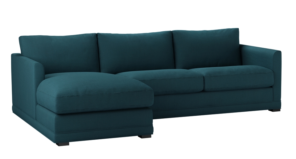 A sofa made for corners. back cushions: feather and fibre color: green covers: fixed seat cushions: feather wrapped foam size: Medium Left Hand Chaise