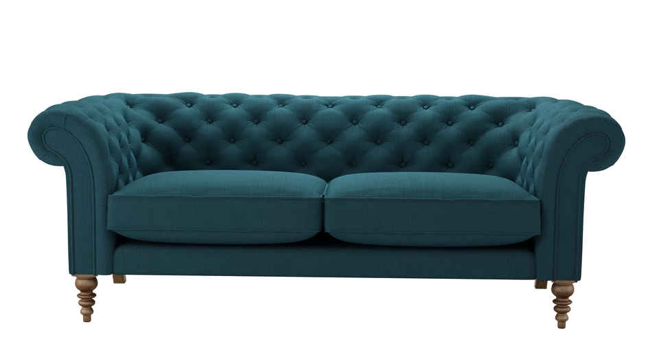 The Chesterfield gets a leggy new look. back cushions: see website color: green covers: see website seat cushions: see website size: Three Seat Sofa