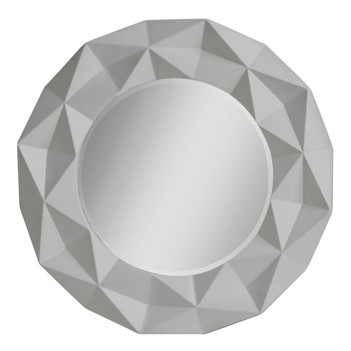 This wall mirror striking geometric frame is comprised of a series of triangles that are raised to produce a 3D effect. Its angular, polygonal shape contrasts with the rounded and bevelled mirrored surface. Colours: Grey Material Compositions: MDF 10%,Polyurethane 50%,Glass 40% Materials: Wood/Synthetic/Glass Assembled Product Weight (kg): 5 Batteries Included: N Batteries Required: N Hob Safe - Ceramic (y/n): N Hob Safe - Electric (y/n): N Hob Safe - Gas (y/n): N Hob Safe - Halogen (y/n): N Hob Safe - Induction (y/n): N Appliance Safety - Dishwasher (y/n): N Appliance Safety - Freezer (y/n): N Appliance Safety - Microwave (y/n): N Appliance Safety - Oven (y/n): N Mirror Hung - H or V: Y Item Assembled: Y Care & Use: Wipe clean with a soft cloth. Do not use abrasive cleaners