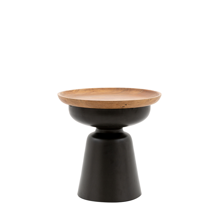 The stylish side table makes a stand out design statement in any room. The dish top is hand turned in solid mango wood and the unusual shaped base is powder coated metal. Material: Mango Wood / Iron Assembly Required: No