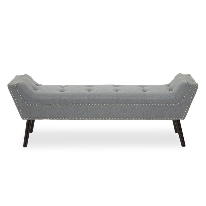 Featuring a button-tufted seat upholstered in tough-wearing grey fabric, this bench will make a contemporary addition to the living area. This bench boasts sloping arms with a stud detail, supported with brown rubberwood tapered legs.
