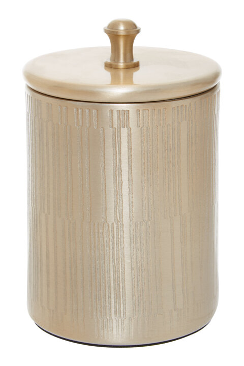 Ideal for a wide array of interiors, the Allegra canister will be a convenient storage solution to the bathroom. Made from aluminium and given a champagne finish, this cylindrical canister with a lid ensures a tidy and organised space. Colours: Gold Material Compositions: Aluminium 100% Materials: Metal Assembled Product Weight (kg): 0.229 Batteries Included: N Batteries Required: N Hob Safe - Ceramic (y/n): N Hob Safe - Electric (y/n): Y Hob Safe - Gas (y/n): Y Hob Safe - Halogen (y/n): Y Hob Safe - Induction (y/n): N Appliance Safety - Dishwasher (y/n): Y Appliance Safety - Freezer (y/n): Y Appliance Safety - Microwave (y/n): N Appliance Safety - Oven (y/n): N Item Assembled: N Care & Use: Wipe with a soft cloth, do not use abrasive cleaners.