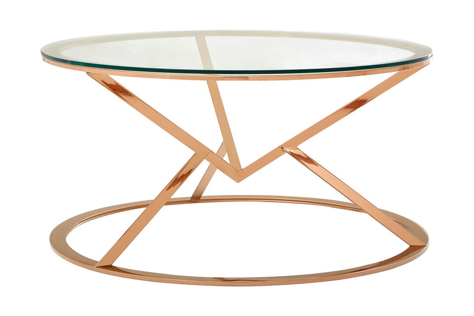 Its base is made from sleek stainless steel, and has a reflective rose gold colour. Two triangular forms create an inverted, asymmetric aesthetic, both of which are connected to wide circles at the top and bottom. Clear tempered glass is used for the tabletop. Display this angular piece with opulent boutique hotel furniture. materials: Metal, Glass composition:100% Capacity: 30Kg Care & Use Instr: Wipe with a soft cloth, do not use abrasive cleaners Dishwasher Safe: N Electric Hob Safe: N Freezer Safe: N Gas Hob Safe: N Halogen Hob Safe: N Induction Hob Safe: N Materials: Metal, Glass Microwave Safe: N Oven Safe: N Product Depth: 90 Product Height: 45 Product Weight (kg): 18.25 Product Width: 90 Item Assembled: N Product Load Bearing Weight: 80kg Floor to Under Table: 43cm Table Height: 45cm Table Diameter: 90cm