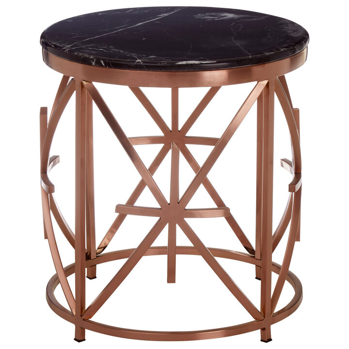This opulent side table has a warm rose gold finish that offers a metallic counterpoint to the black marble top. The body features a combination of straight and slightly curving stainless steel lines. White vein detail on the marble gives the table a textured look. materials: Metal, Stone composition:Wood, Metal Capacity: 80Kg Care & Use Instr: Wipe Clean With A Soft Cloth. Do Not Use Abrasive Cleaners. Dishwasher Safe: N Electric Hob Safe: N Freezer Safe: N Gas Hob Safe: N Halogen Hob Safe: N Induction Hob Safe: N Materials: Metal, Stone Microwave Safe: N Oven Safe: N Product Depth: 50 Product Height: 55 Product Weight (kg): 12.5 Product Width: 50 Item Assembled: N