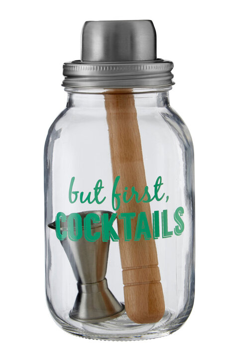 This cocktail set contains all of the tools necessary to produce tasty drinks. The clear glass jar holds up to 800ml of liquid, topped by a stainless steel cap with an integrated strainer. A steel cup covers the lid, while a coordinating jigger is included for accurate measuring. Its green But First, Cocktails... message stands out clearly against the glass.