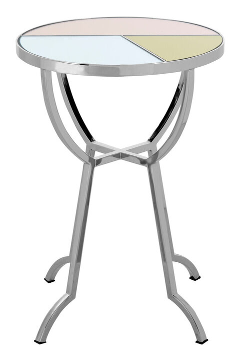 Minimalist modern art serves as the inspiration for the Arbus side table. The round top features a segmented, geometric design with segments of pastel green, pink and blue separated by strips of stainless steel. materials: Glass composition:Metal, Glass Care & Use Instr: Wipe with a soft cloth, do not use abrasive cleaners. Dishwasher Safe: N Electric Hob Safe: N Freezer Safe: N Gas Hob Safe: N Halogen Hob Safe: N Induction Hob Safe: N Materials: Glass Microwave Safe: N Oven Safe: N Product Depth: 41 Product Height: 58 Product Weight (kg): 4.8 Product Width: 41 Item Assembled: N