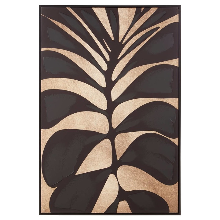 The leaf design is achieved by applying oil to textured canvas. Gold motifs stand out boldly against the sleek black background. The canvas surface is stretched across a frame crafted from solid wood. materials: Wood, Textile, Synthetic composition:100% Aluminium Care & Use Instr: Wipe with a soft cloth, do not use abrasive cleaners. Dishwasher Safe: N Electric Hob Safe: N Freezer Safe: N Gas Hob Safe: N Halogen Hob Safe: N Induction Hob Safe: N Materials: Wood, Textile, Synthetic Microwave Safe: N Oven Safe: N Product Depth: 4.3 Product Height: 122.6 Product Weight (kg): 3 Product Width: 82.6 Item Assembled: Y