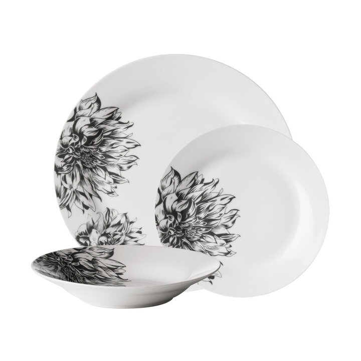 "Dine in style with our stylish 12 piece Avie Botanic dinner set, that will make an elegant addition to your tableware. Included in the set are 4 x dinner plates, 4 x side plates and 4 x bowls. Each piece is made from white porcelain ensuring durability, while the beautiful black flower design, accentuates the charming style of the set. The smooth surface is easy to clean in warm soapy water making it ideal for everyday use. The set ensures you can enjoy starters, mains and desserts for four people. Adding a sense of occasion to your meal, the artistically designed dinner set will become an everyday delight each time you sit down for a meal." materials: Ceramic composition:Porcelain. 100% colour: White Care & Use Instr: Dishwasher Safe Dishwasher Safe: Y Electric Hob Safe: N Freezer Safe: N Gas Hob Safe: N Halogen Hob Safe: N Induction Hob Safe: N Materials: Ceramic Microwave Safe: N Oven Safe: N Product Depth: 18 Product Height: 28 Product Weight (kg): 5.45 Product Width: 28 Item Assembled: Y Courier Service: Evri Parcel