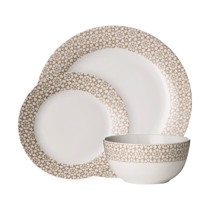 "Dine in style with our stylish 12 piece Avie Casablanca dinner set, that will make a wonderful addition to your tableware. Included in the set are 4 x dinner plates, 4 x side plates and 4 x bowl. Each piece is made from white porcelain ensuring durability, while the stylish natural colour shapes detail including stars and geometric designs, accentuate the contemporary style of the set. The smooth surface is easy to clean in warm soapy water making it ideal for everyday use. The set ensures you can enjoy starters, mains and desserts for four people. Adding a sense of occasion to your meal, the decoratively designed dinner set will become an everyday delight each time you sit down for a meal." materials: Ceramic composition:Porcelain. 100% colour: White, Natural Care & Use Instr: Dishwasher Safe Dishwasher Safe: Y Electric Hob Safe: N Freezer Safe: N Gas Hob Safe: N Halogen Hob Safe: N Induction Hob Safe: N Materials: Ceramic Microwave Safe: N Oven Safe: N Product Depth: 18 Product Height: 28 Product Weight (kg): 5 Product Width: 28 Item Assembled: Y Courier Service: Evri Parcel