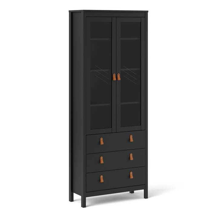 A modern glass display cabinet with two doors and three drawers in a striking design complete with brown leather tab handles, also available in white Matt Black - High quality laminated board (resistant to damage and scratches, moisture and high temperature) - Made from PEFC Certified sustainable wood - Easy self assembly - Made in Denmark - Easy gliding drawer runners - Adjustable hinges on all doors