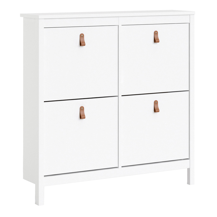 A modern shoe cabinet with four storage compartments in a striking design complete with brown leather tab handles, also available in contrasting matt black White - High quality laminated board (resistant to damage and scratches, moisture and high temperature) - Made from PEFC Certified sustainable wood - Easy self assembly - Made in Denmark - High quality fixings and hinges used throughout