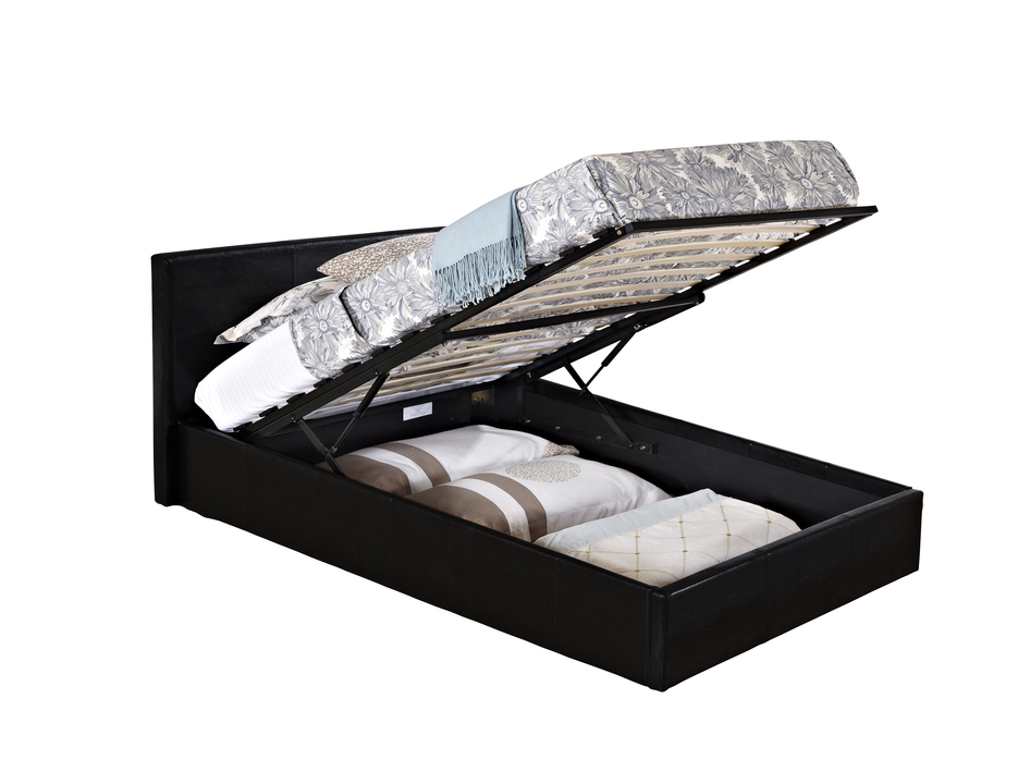 Product Description: A contemporary statement design, the Berlin bed features luxury faux leather upholstery complemented by dark wooden feet.