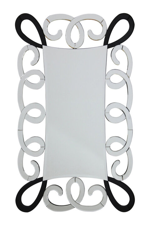 This stylish accent piece represents a contemporary take on traditional French scroll mirrors. The central mirrored surface has a concaved design, accentuated by the black scrolled glass that appears to be pulling each corner upwards. materials: Wood, Glass composition:MDF 0%,Mirrored Glass 0% colour: Black, Silver Care & Use Instr: Wipe Clean With A Damp Cloth. Do Not Use Abrasive Cleaners Dishwasher Safe: N Electric Hob Safe: N Freezer Safe: N Gas Hob Safe: N Halogen Hob Safe: N Induction Hob Safe: N Materials: Wood, Glass Microwave Safe: N Oven Safe: N Product Depth: 2.2 Product Height: 120 Product Weight (kg): 13 Product Width: 73 Item Assembled: Y Courier Service: BSTAR 1MAN