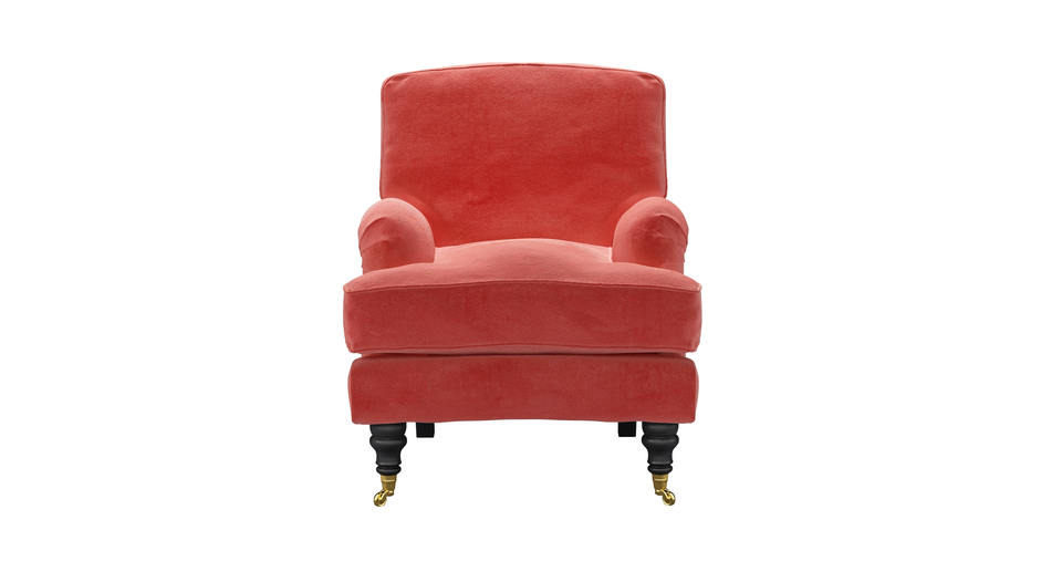 A classic design and one of our most popular sofas. back cushions: feather and fibre color: pink covers: fixed seat cushions: feather wrapped foam size: Small Armchair