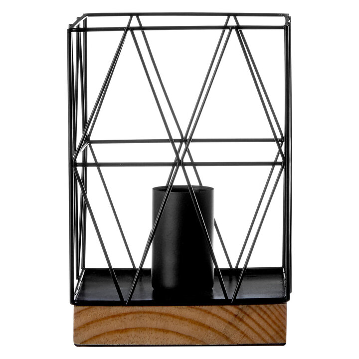 "With its metal wireframe shade this table lamp is suited to coordinating with geometric textiles and furniture. The shade blends into a slim metal plate base, with a cylindrical fitting at the centre which looks great when matched with an Edison-style bulb. The shade is mounted on to a thick base made from natural wood." materials: Metal, Wood composition:100% Bulb Included: N Bulb Info: 1 Qty E27 40W Care & Use Instr: "Wipe clean with a soft cloth. Do not use abrasive cleaners. Please note, this product composition contains natural wood, variations in colour may apply." Dishwasher Safe: N Electric Hob Safe: N Freezer Safe: N Gas Hob Safe: N Halogen Hob Safe: N Induction Hob Safe: N Materials: Metal, Wood Microwave Safe: N Oven Safe: N Product Depth: 13 Product Height: 19 Product Weight (kg): 0.8 Product Width: 13 Item Assembled: Y